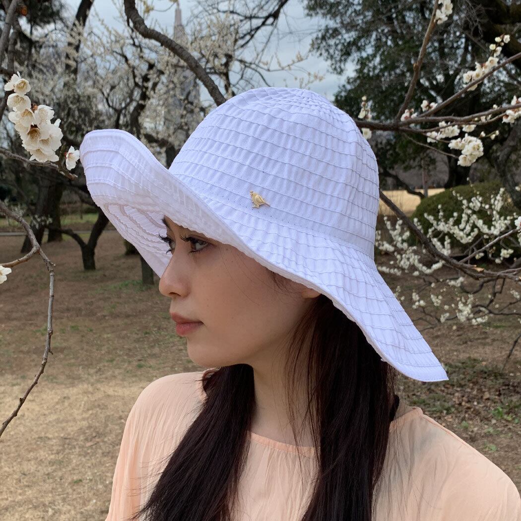 つば広のお帽子です。夏のバカンスに大活躍です。 小鳥モチーフ(アンティークゴールド)付き カラー:WHT 素材 :ポリエステル100% サイズ:頭囲56cm 原産国:中国